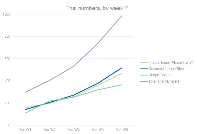 Figure 1: The total number of trials for COVID-19 has grown steadily each week.1 When filtering for the unique assets under investigation globally, we observed a slowdown in growth.2