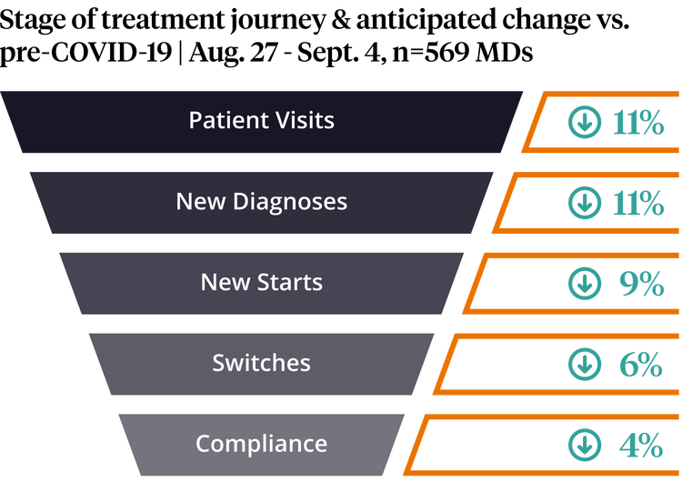 This shift in hospital engagement creates a clear “home field advantage” for incumbents and makes it more challenging for medtech manufacturers to win competitive accounts. Customers are expected to slow down switching from existing vendors, creating opportunities for incumbents to consolidate business and increase share of wallet. As an analog to the challenges the healthcare system is facing, a recent ZS survey shows that we are still seeing limitations in new patient visits and diagnoses (see Figure 1 below). Patients often aren’t showing up based on COVID fears, and therefore hospitals are limiting access to minimize COVID spread and are less likely to switch to a different medtech supplier.