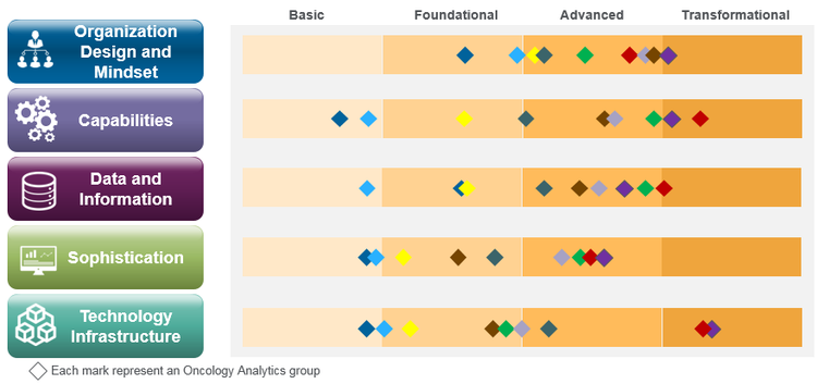 - Organizations with a defined vision and strategy for oncology analytics make proactive investments to build capabilities around people and processes.