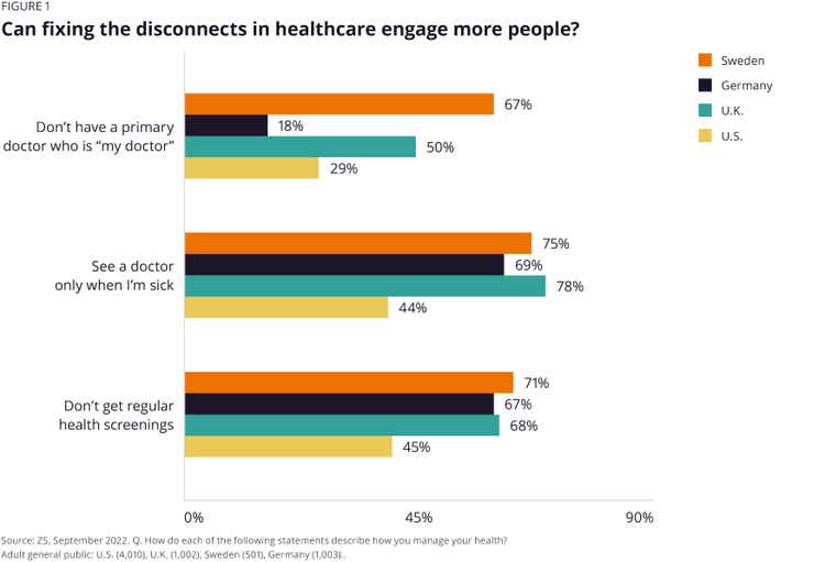 - Reluctance to get preventive care: Nearly half of U.S. respondents (45%) say they don’t put any effort into getting regular health screenings. That number is even higher for U.K. respondents (68%), German respondents (67%) and Swedish respondents (71%). See Figure 1.