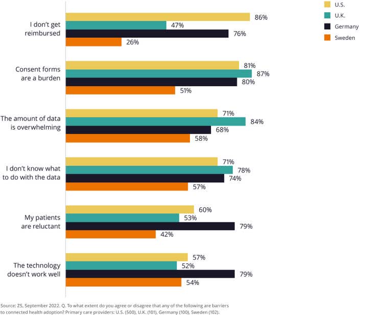 ZS’s first connected health study revealed that U.S. consumers and healthcare providers want the benefits that connected care offers, such as convenience and better diagnosis and treatment. To follow up, we broadened our research to understand better what these populations are experiencing in the U.K., Germany and Sweden. There were some universal similarities, despite the significant differences in how these healthcare markets are structured.
