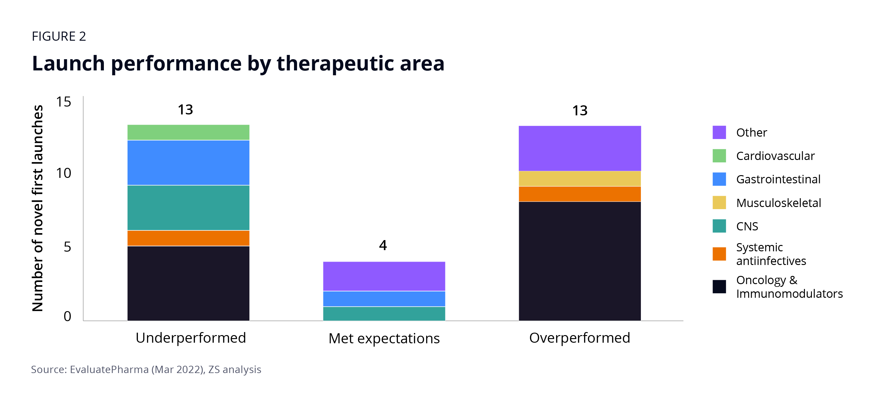 While performance issues cut across therapeutic areas, drugs targeting the central nervous system and gastrointestinal indications were the most likely to underperform—with three in four falling short of expectations. Oncology and immunomodulators performed better, with more than 60% beating estimates. Among the remaining, more than three-quarters either met or exceeded expectations.