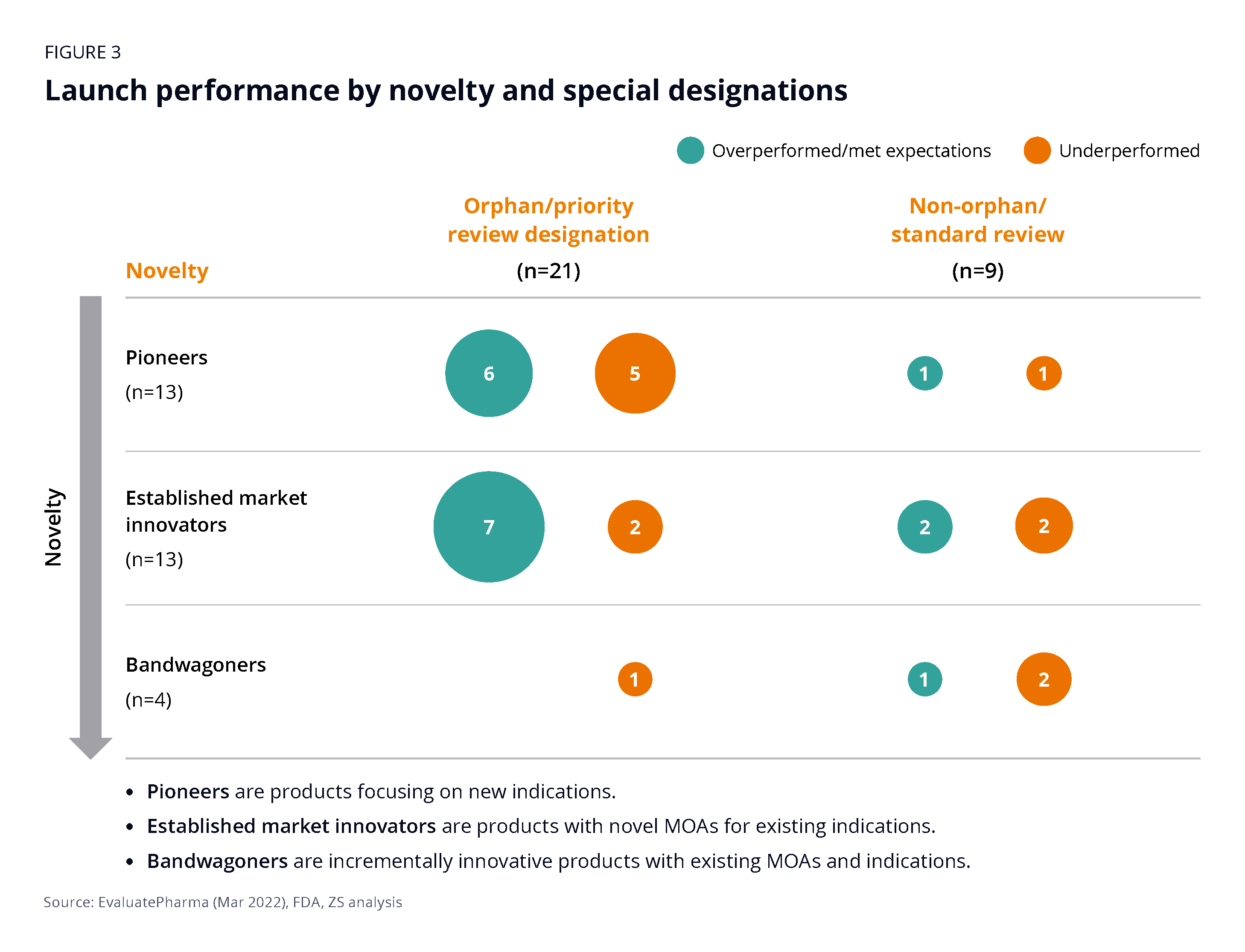 To better understand why first launches succeeded or failed, we started by grouping drugs into three categories: pioneers (13), innovators in established markets (13) and “bandwagoners” (4). We also looked at launch tactics, market access, and orphan and priority review status.