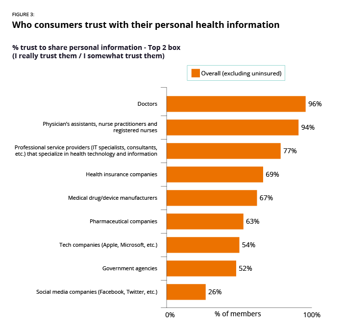 Clearly, the potential exists for health plans to bridge these gaps. When it comes to consumer trust, health plans have a narrow lead over some other industry players, such as medtech and pharma companies. Compared to the 96% of consumers who say they really or somewhat trust doctors, however, health plans still have a lot of ground to make up, earning the trust of 69% (see Figure 3). By addressing the challenges that consumers and healthcare providers experience daily, health plans can begin to expand upon consumers’ moderate levels of trust.
