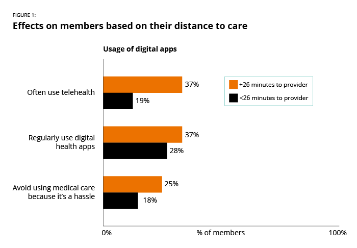 A consumer’s travel time to access care can affect their health. We saw in our research that those who live further away from a provider tend to avoid care more often. When they do seek care, they are more likely to use virtual resources. People who must travel more than 26 minutes to reach their closest primary care provider use telehealth (37% vs. 19%) and digital health apps (37% vs. 28%) more often than those who live nearby (Figure 1).