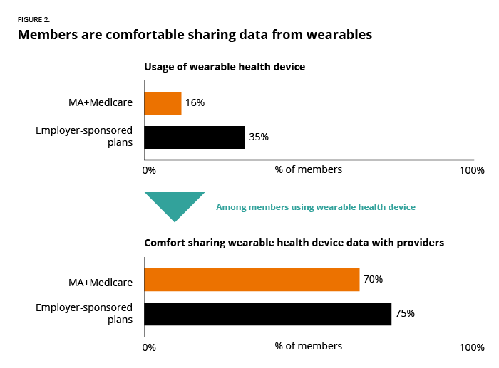 There is opportunity to positively affect members of employer-based plans by better connecting their health data, as they are already using connected health tools: 35% of employer-based plan members use or have a wearable health monitoring device. And of those members, 75% are comfortable sharing this data with providers (see Figure 2). They also use online health portals at a higher rate than the overall population we surveyed (44% vs. 40%).