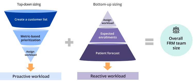 As FRMs work both proactively and reactively, sizing based on potential and volume alone doesn’t provide the full picture. A top-down and bottom-up sizing approach looks at FRM activities and patient enrollments to better understand the proactive and reactive workload that will be required. Companies often look at one side of the equation to calculate the resourcing requirements for their FRM teams. This leaves them with an incomplete picture either from a customer engagement standpoint or expected patient caseload perspective. Sizing both ways enables companies to validate their FRM sizing given their nontraditional activities. These are some common ways to size; however, every FRM team requires fit-for-purpose considerations.