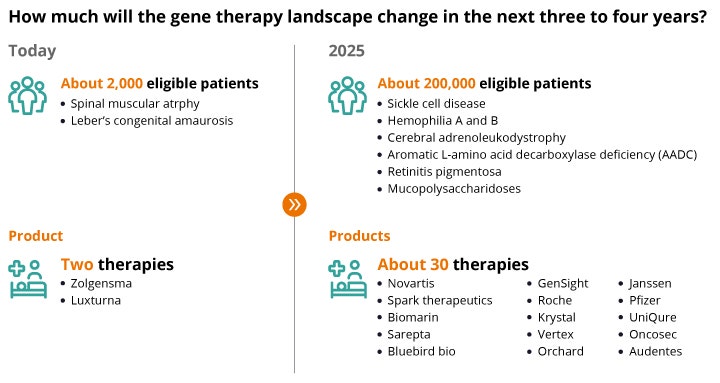 There are several explanations for this slow uptake, ranging from barriers around the logistics of deploying these treatments, to a general lack of awareness of them by patients and physicians—not to mention hurdles tied to reimbursement and commercialization. Gene therapy manufacturers have an opportunity to play a major role in addressing these challenges to help pave the way for a future gene therapy landscape. If successful, these actions may help manufacturers tap into the potential pool of gene-therapy-eligible patients that’s expected to reach approximately 400,000 in the U.S. by 2025.