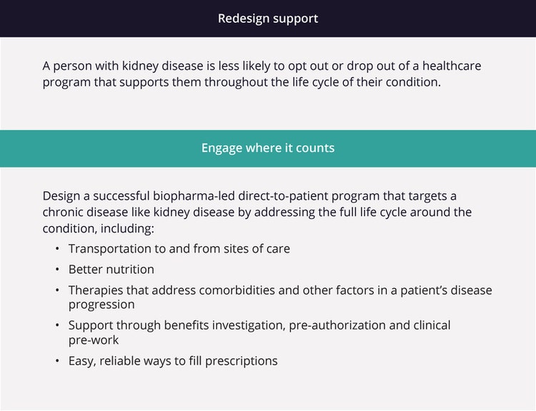 Direct-to-patient programs can address the full life cycle around a chronic condition like diabetes, kidney disease or obesity to keep people engaged in activities to better manage their health.
