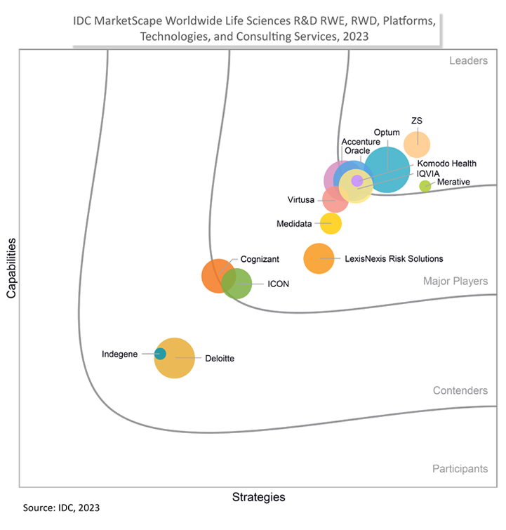 Source: “IDC MarketScape: Worldwide Life Science R&D RWE, RWD, Platforms, Technologies, and Consulting Services 2023 Vendor Assessment,” by Nimita Limaye (doc #US51186723, September 2023). Copyright IDC.
