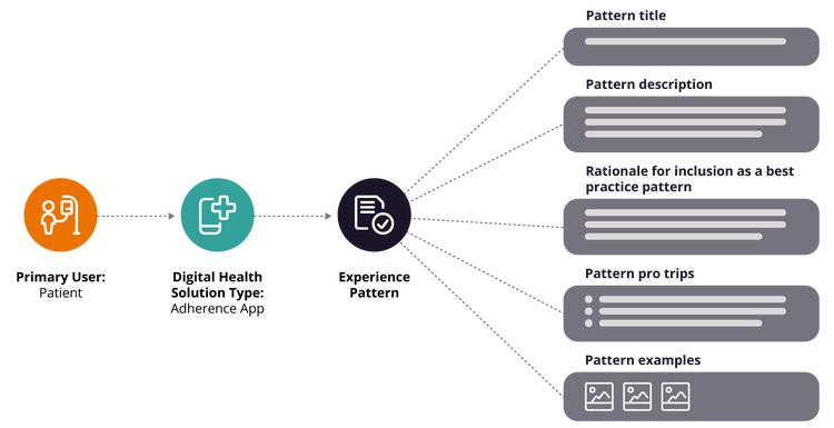 3. Apply patterns with accuracy. Engagement patterns can dramatically affect the way teams create solutions since they have the power to enforce prioritization and accelerate design decisions. A consistent framework helps teams choose and apply the most relevant patterns to create effective digital health solutions. Incorporating patterns during the early stages of opportunity design can have an especially powerful effect by de-risking decisions and neutralizing guesswork that’s much more costly to address later.