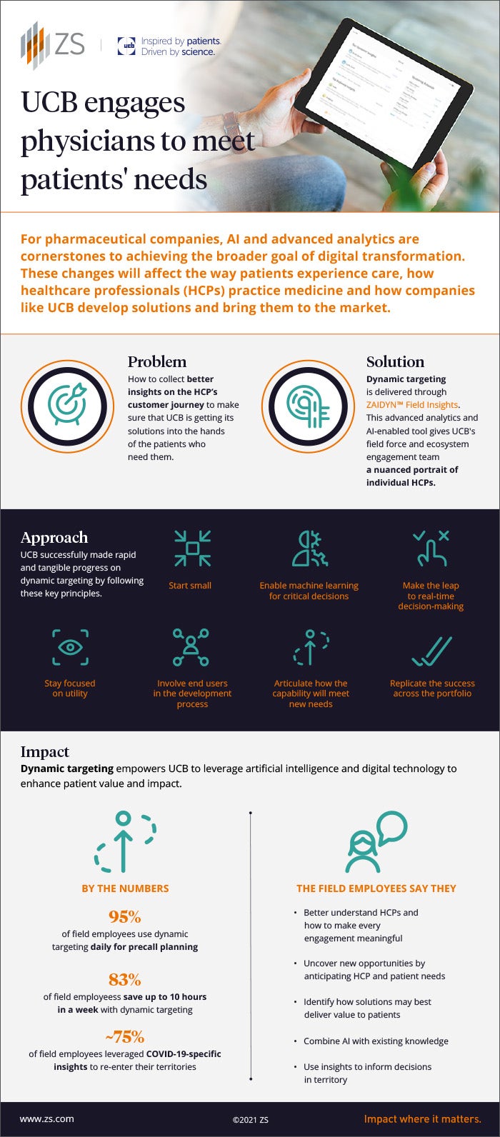 Global biopharmaceutical company UCB, which focuses on improving life for patients with severe immunological and neurological conditions, achieved a milestone in its digital transformation journey. The company innovated by teaming up with ZS to use the AI-enabled ZAIDYN Field Insights digital platform, built with cloud services from Amazon Web Services, to reinvent its sales targeting approach with dynamic targeting. A key goal for this tool was to improve how UCB’s field employees connect with healthcare providers and help meet patient needs. And the success of this cross-functional initiative was recognized as the Most Valuable Data and Insights Initiative at the Reuters Pharma Awards USA 2020.