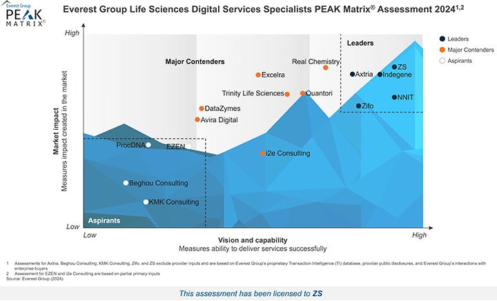 In the Everest Group Life Sciences Digital Services Specialists PEAK Matrix® Assessment 2024, the research firm positioned ZS in the Leader category. The Leader category is the assessment’s highest classification, followed by Major Contenders and Aspirants.