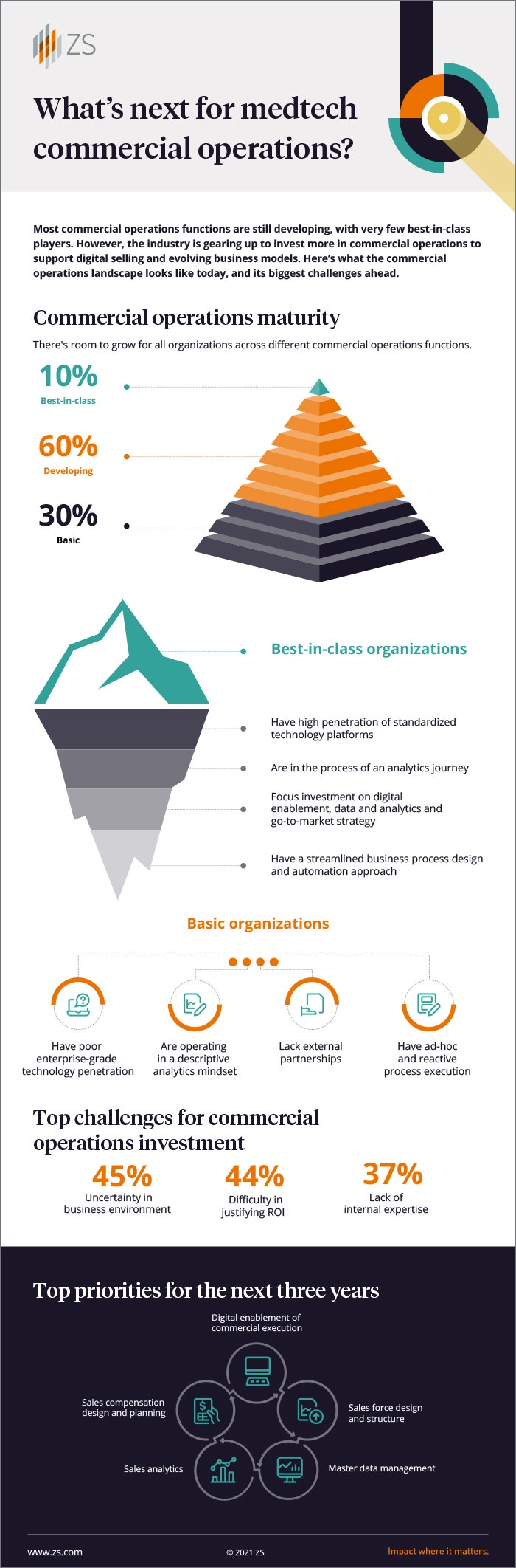 ZS’s medtech commercial operations benchmarking study explored the current maturity, future priority areas and investment challenges in this industry. Here’s what the commercial operations landscape in medtech looks like today and its top priorities for the next three years.